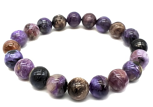 Ce bracelet est une œuvre d'art, composé de perles de charoïte soigneusement sélectionnées pour leur couleur violette intense et leurs motifs chatoyants. Chaque perle, polie pour révéler sa beauté naturelle, contribue à créer un bijou unique en son genre, évoquant une aura de spiritualité et de mystère.